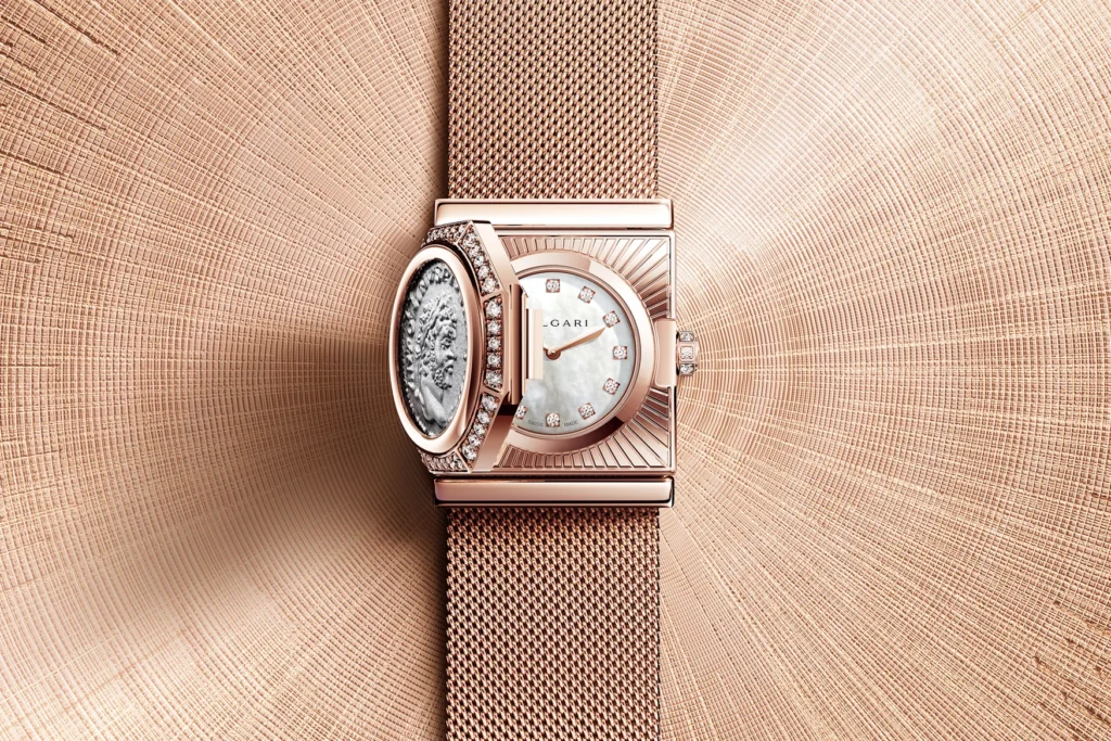 First conceived in the mid-1960s, the Monete has long embodied Bulgari’s enduring dialogue with the ancient world. The new Maglia Milanese Monete Secret Watch renews this legacy with an authentic Roman coin from 198–297 AD, portraying Emperor Caracalla and concealing a dial of iridescent mother-of-pearl set with twelve diamond hour markers.